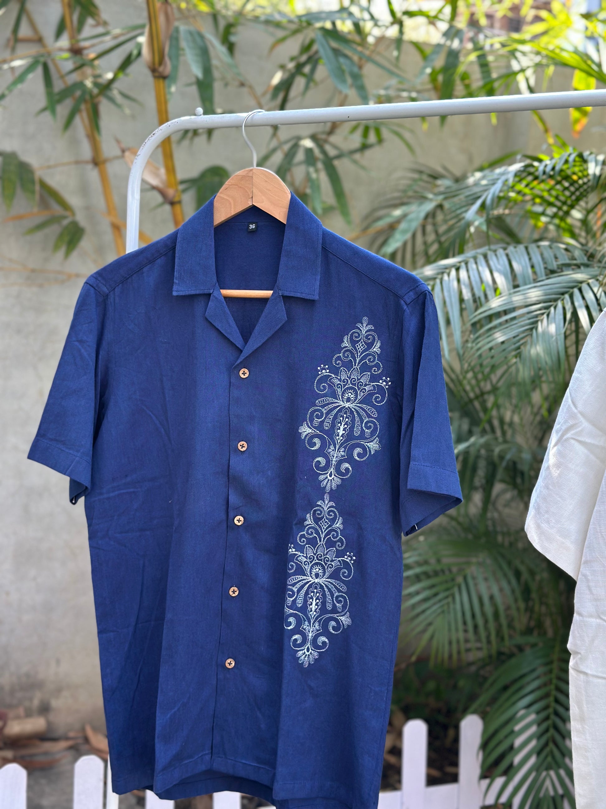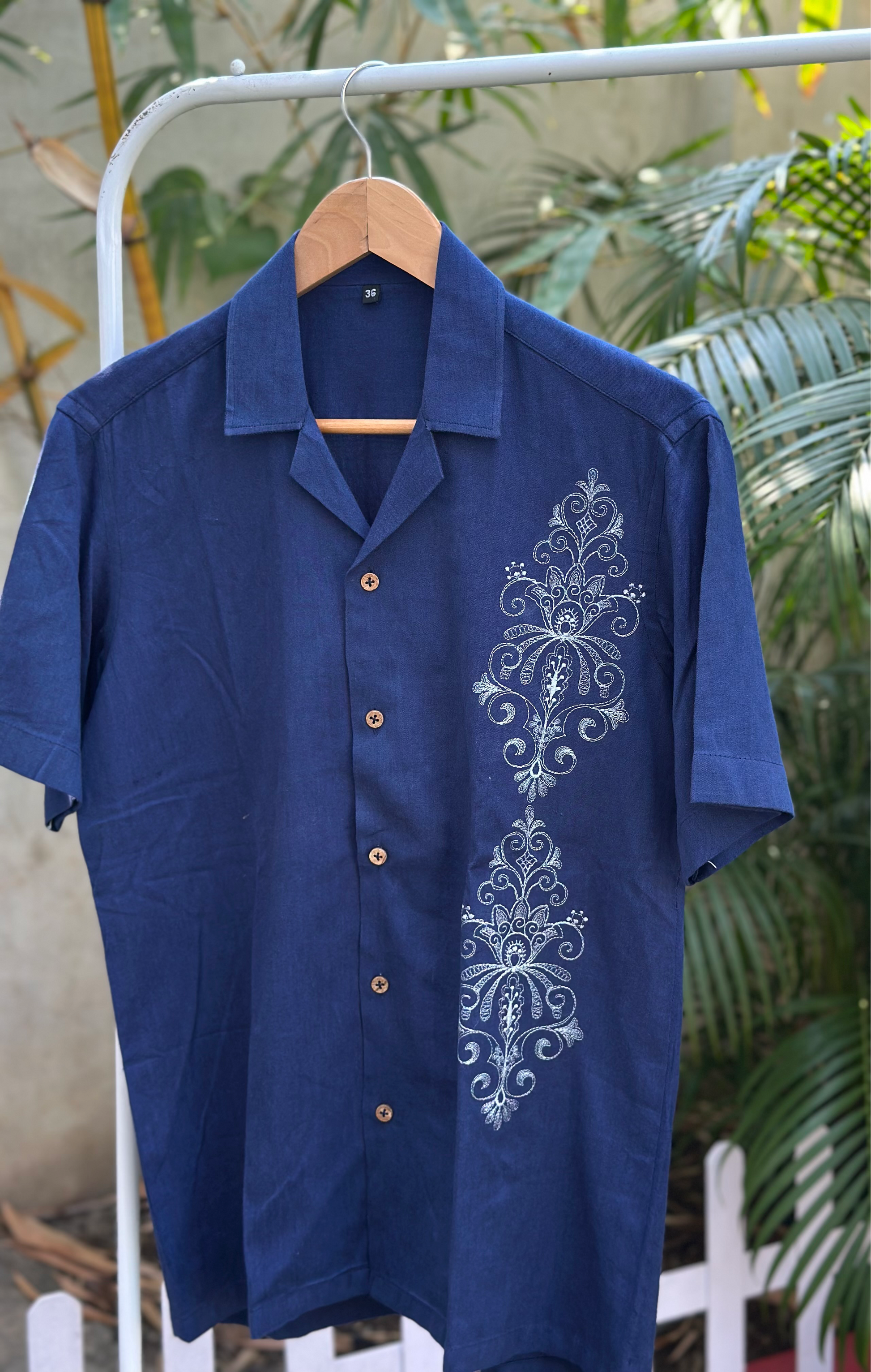 Our rose cross stitch shirt, crafted from handloom bamboo cotton fabric. Choose eco-friendly fashion today.