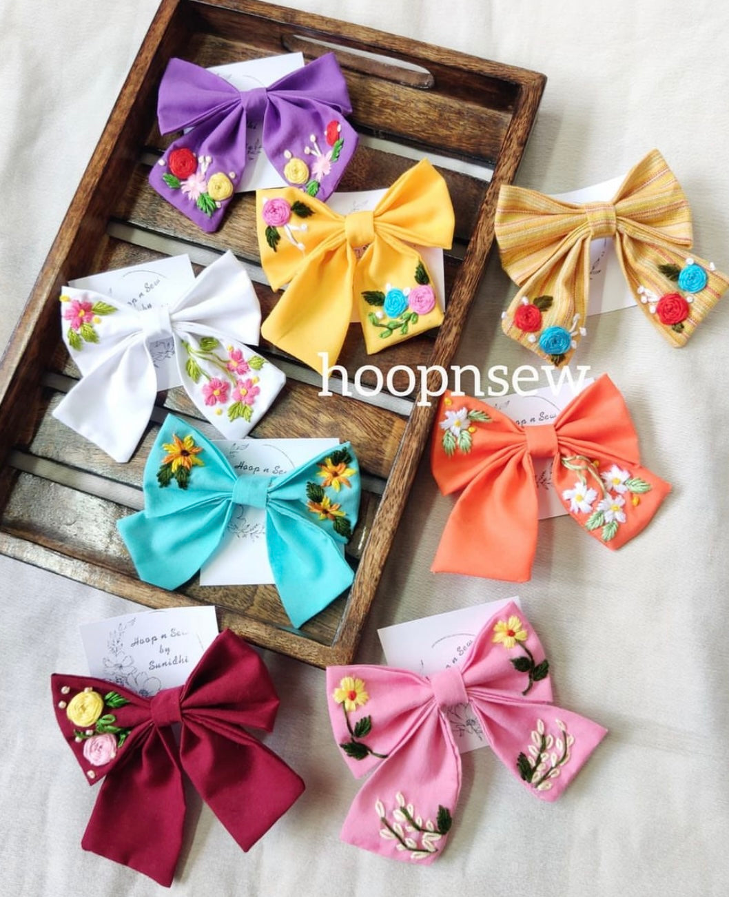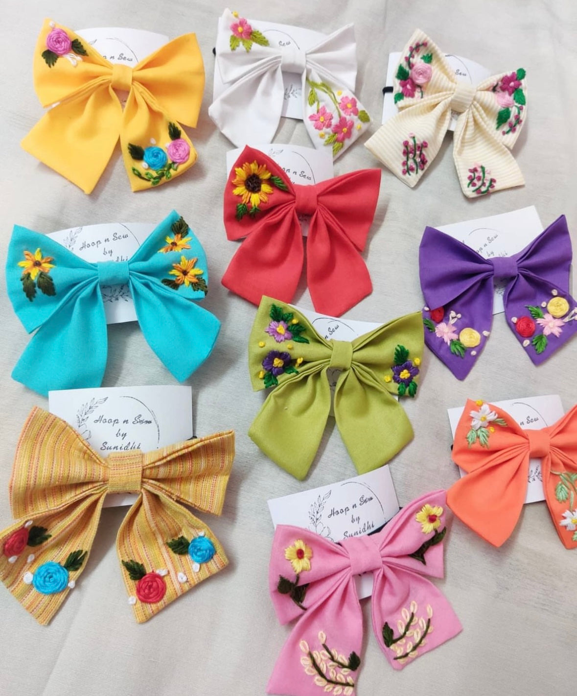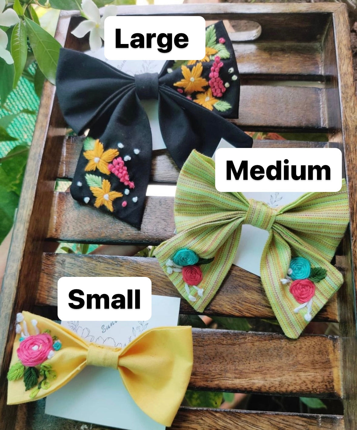 Select your preferred color and size from the drop-down menu below, each featuring exquisite embroidery. Refer to the size comparison image for guidance. Please note that customisation options are not available for bows.