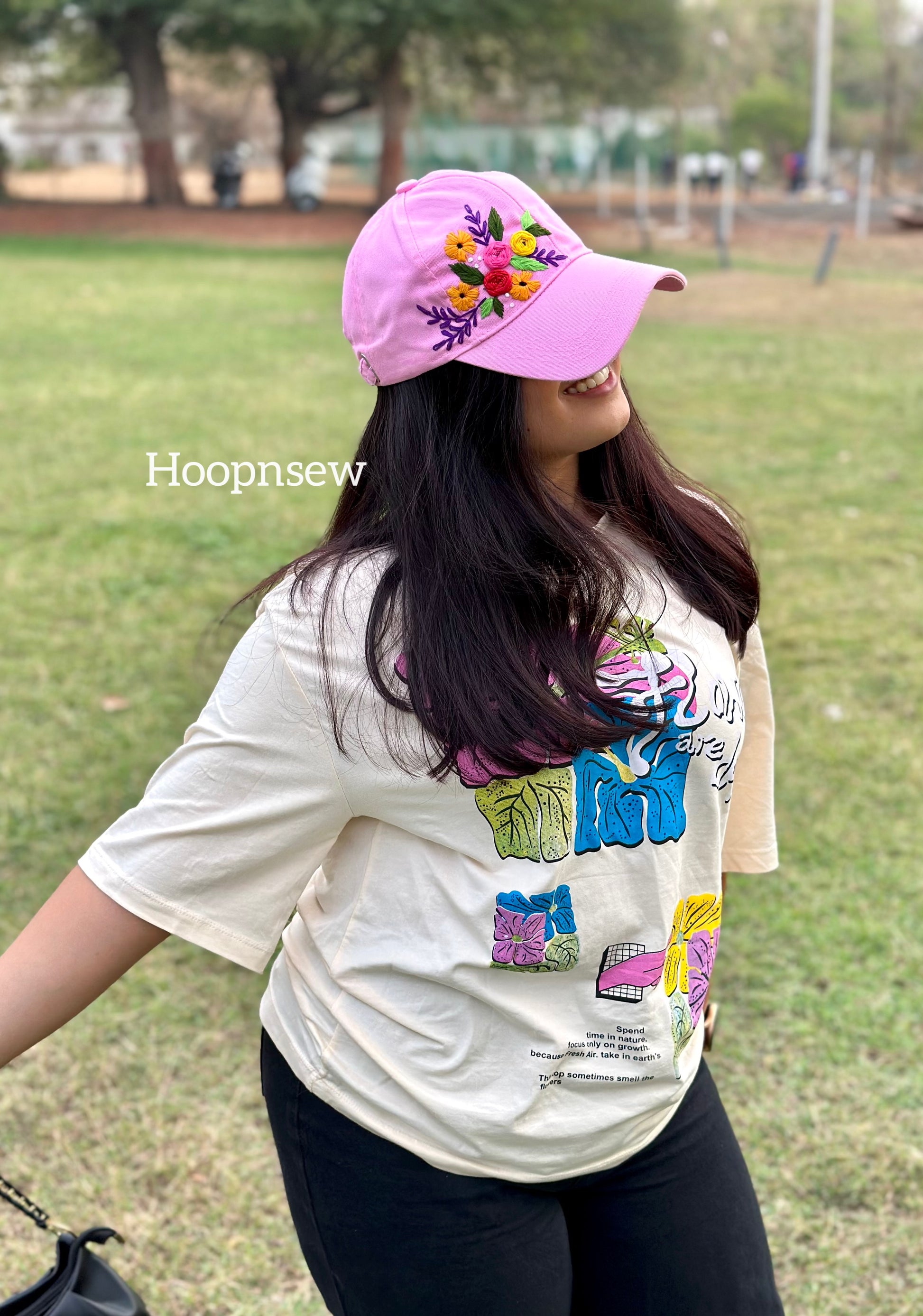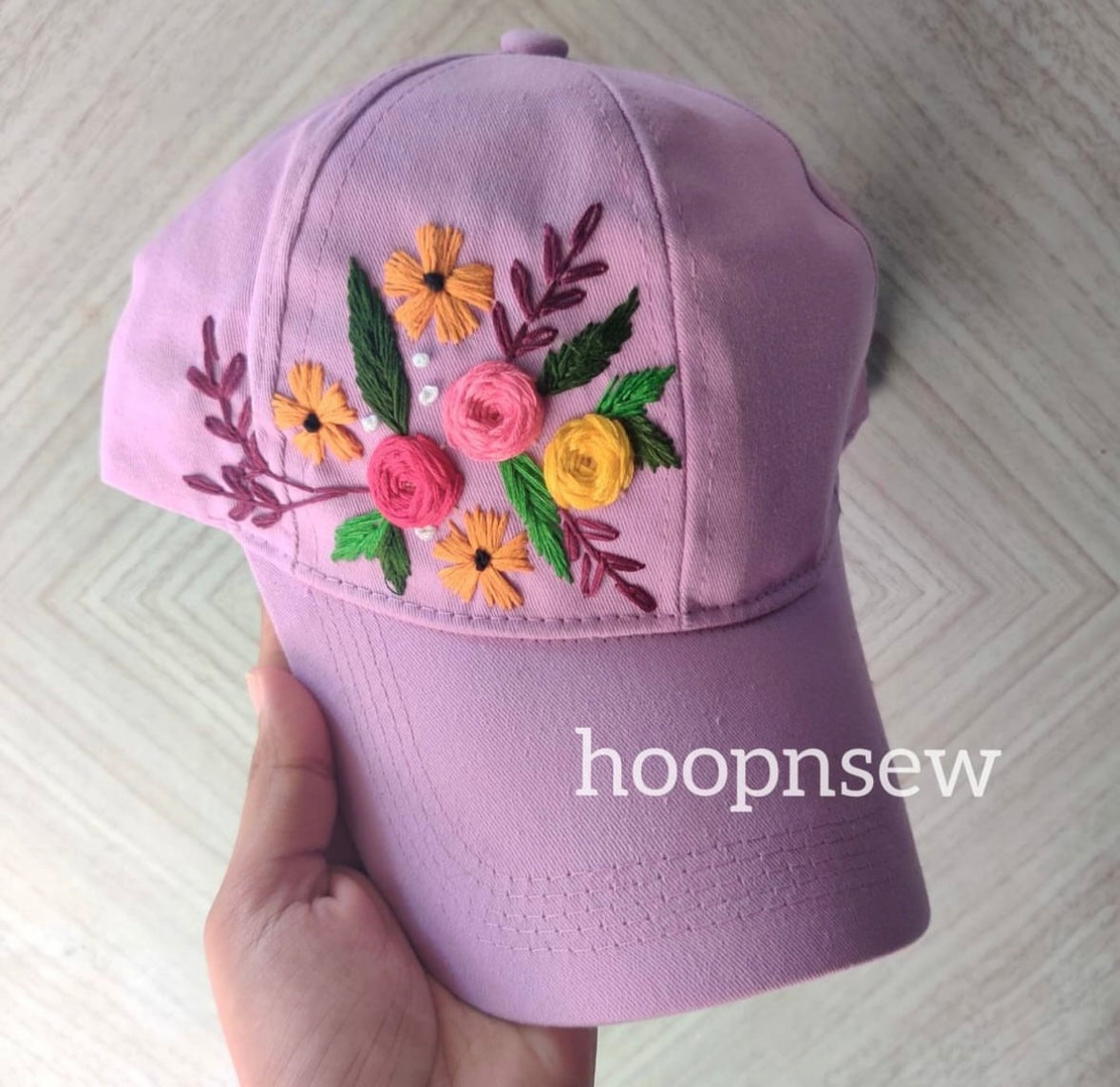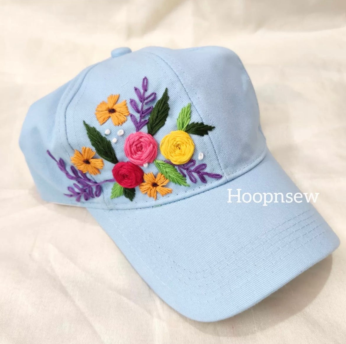Stay protected from the sun while looking cute in our bespoke floral embroidered cap! Take a look at all the different colours available by clicking on the drop-down menu.