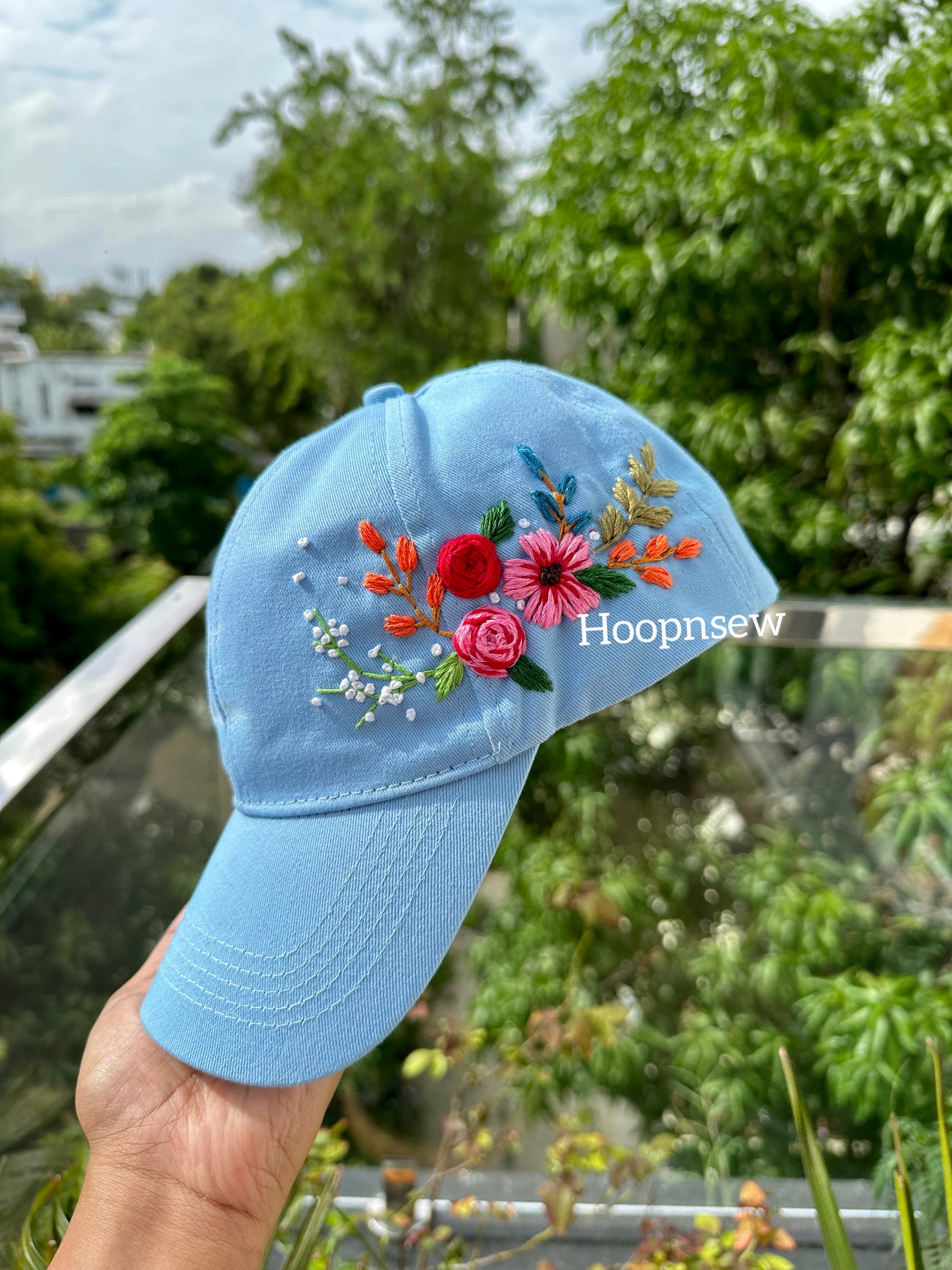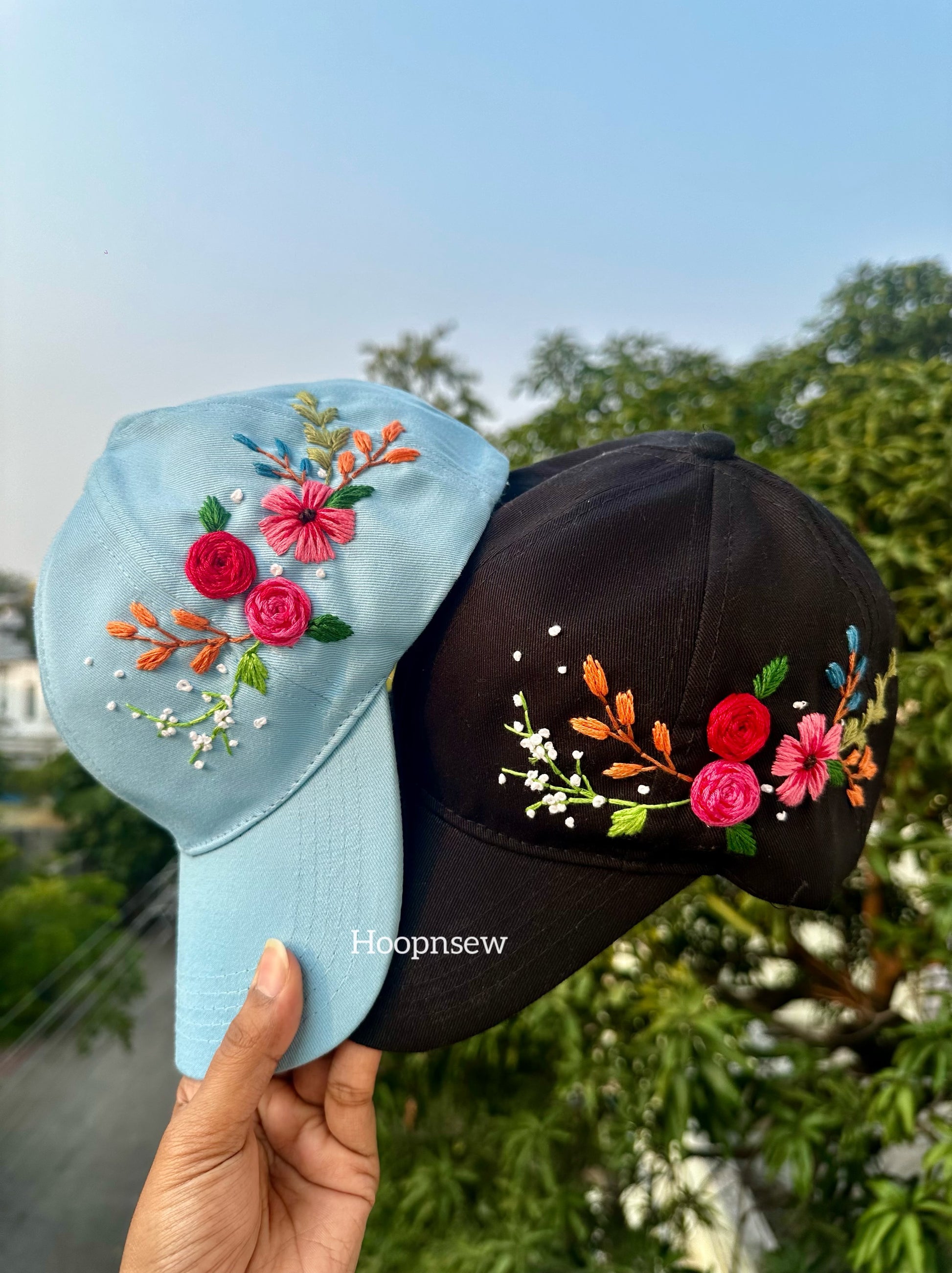 Stay protected from the sun while looking cute in our bespoke floral embroidered cap! Take a look at all the different colours available by clicking on the drop-down menu.