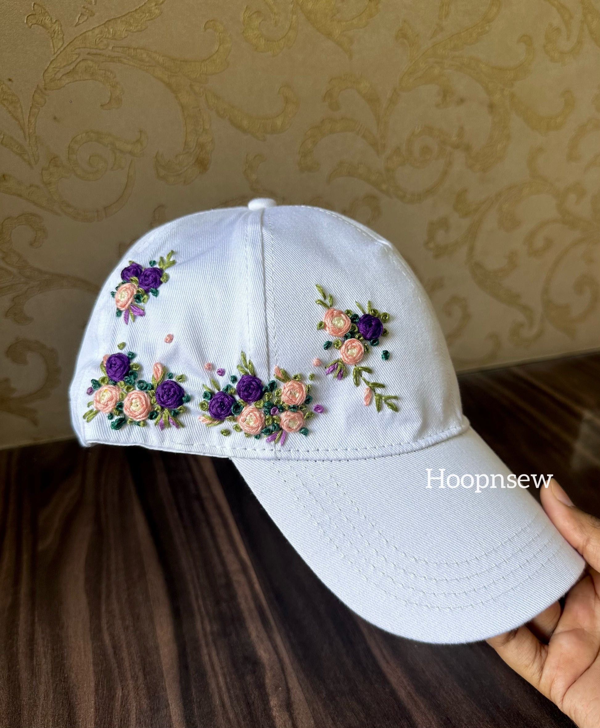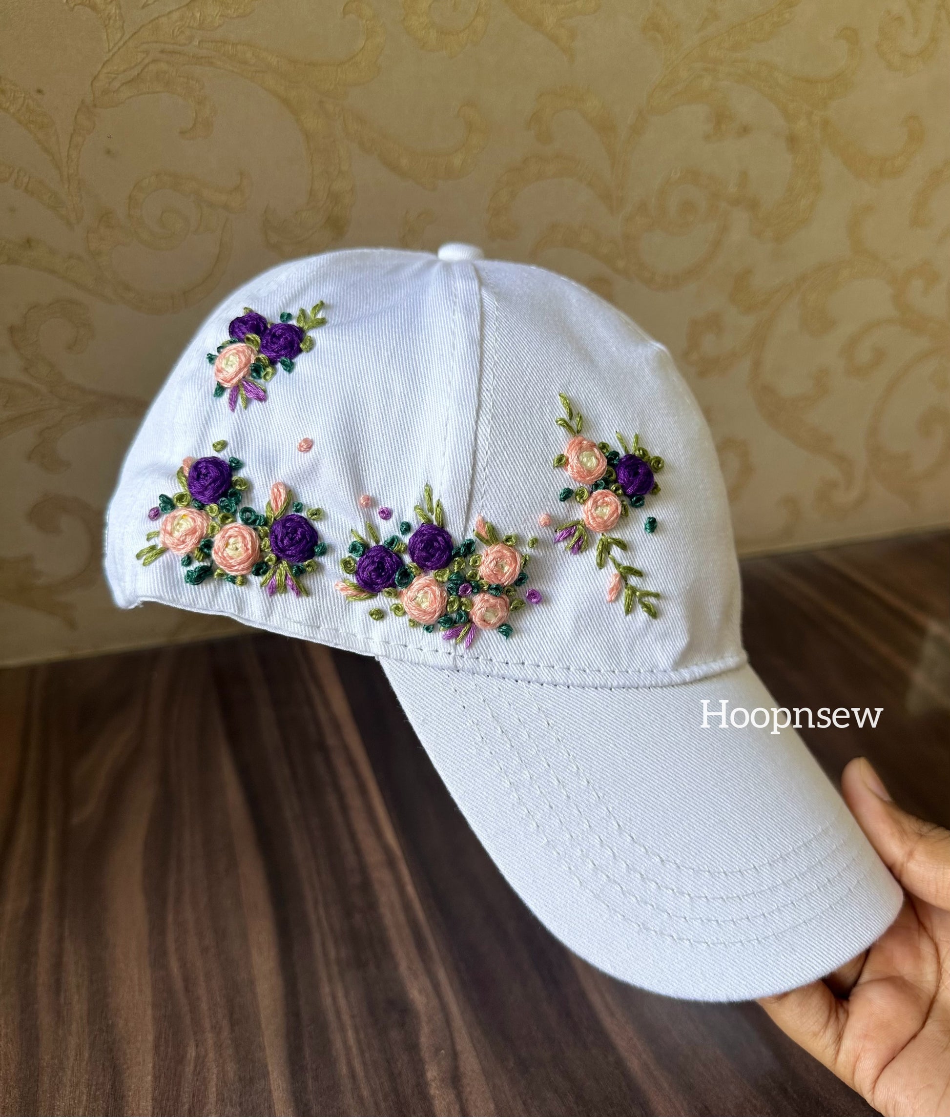 Stay protected from the sun while looking cute in our bespoke floral embroidered cap with roses! Take a look at all the different colours available by clicking on the drop-down menu.