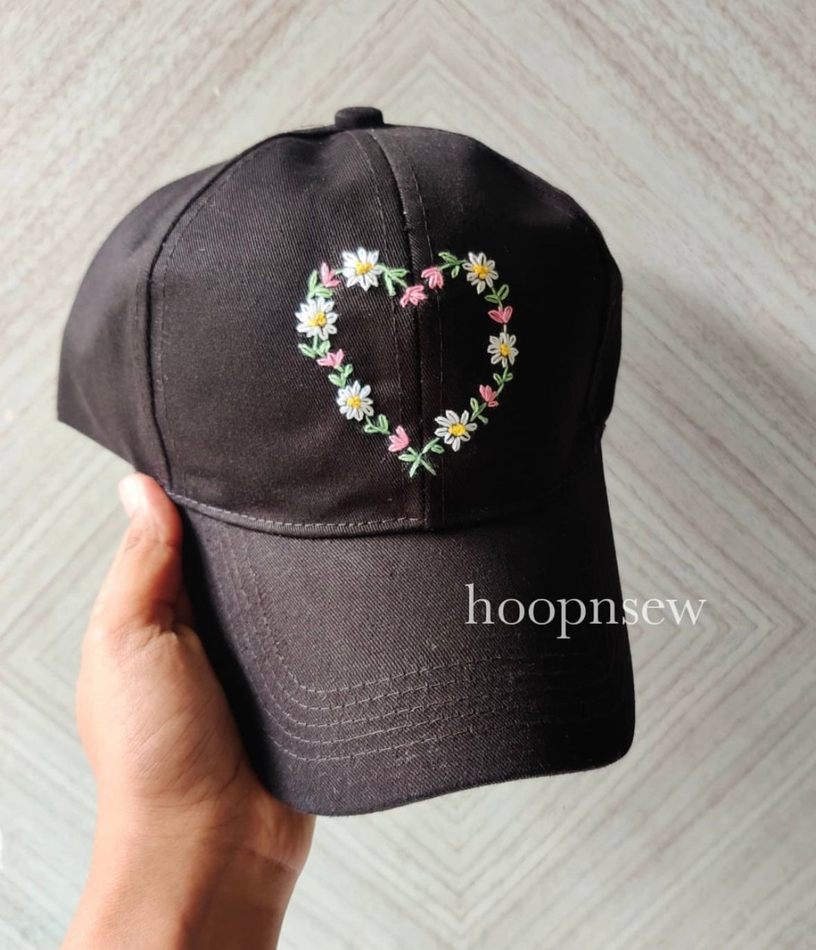 Stay protected from the sun while looking cute in our bespoke hand-embroidered cap! Take a look at all the different colours available by clicking on the drop-down menu.